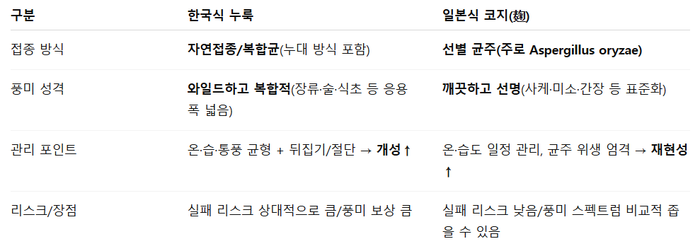 한국 누룩은 복합성, 코지는 표준화라는 장점을 갖고 있고, 초보는 코지→누룩 순으로 배우면 실패를 줄이면서도 풍미의 지평을 빠르게 넓힐 수 있습니다.