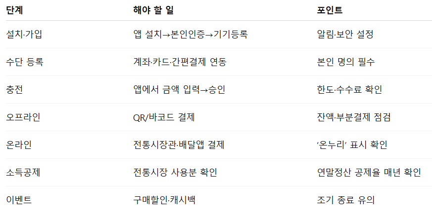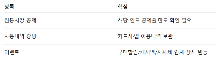 증빙 팁: 전통시장 사용처 결제내역을 카드사/온누리 앱에서 내려받아 연말정산 대비 자료로 보관합니다.