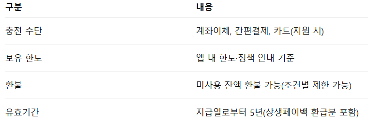 환불/출금: 미사용 잔액 환불은 본인 계좌로 가능합니다. 프로모션성 잔액은 환불 제한 가능성이 있으므로 안내문을 확인합니다.