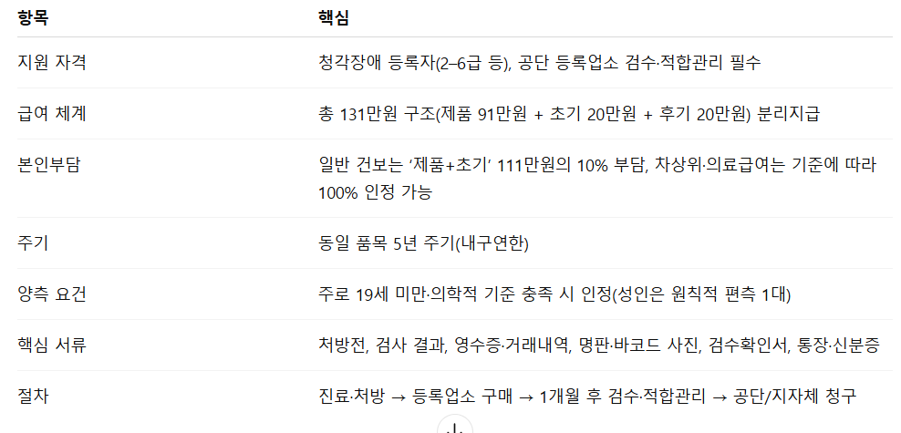 - 이비인후과 진료 → 청력검사(순음·어음) → ‘보조기기 처방전’ 발급.