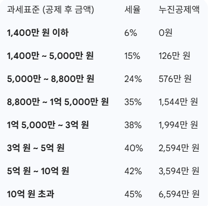공식: (과세표준 × 세율) - 누진공제액 = 내야 할 세금