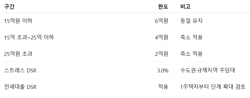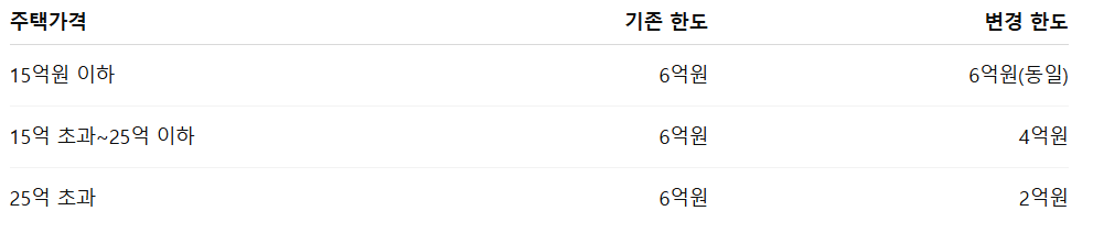 15억원 이하는 6억원 한도를 유지하되, 15억 초과 25억 이하는 4억원, 25억원 초과는 2억원으로 축소합니다.