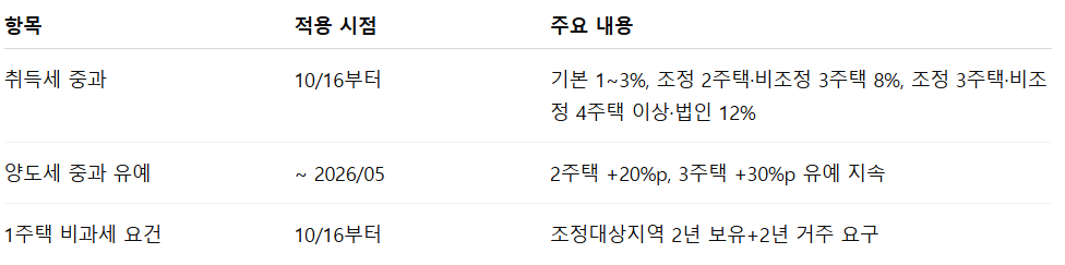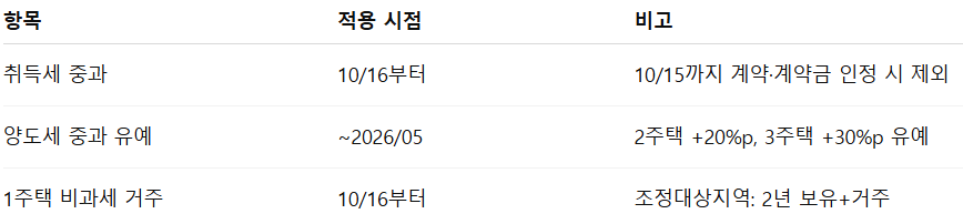 A. 취득세 중과는 공고일(10/16)부터, 양도세 중과 유예는 2026년 5월까지 유지됩니다. 1세대1주택 비과세는 10/16부터 2년 보유+거주 요건이 적용됩니다.