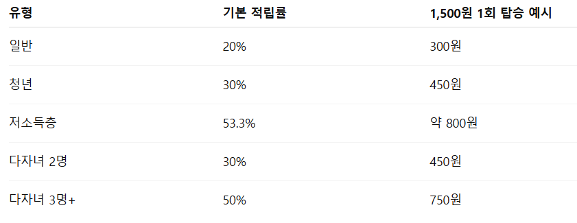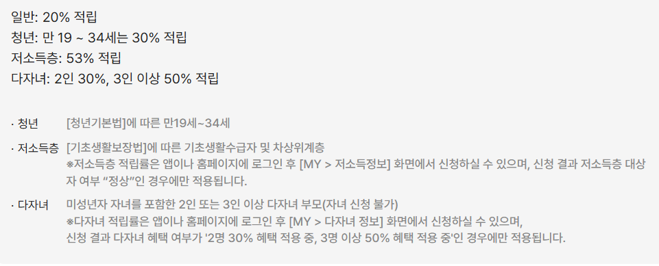- 적립률: 일반 20%, 청년 30%(만 19–34세), 저소득층 53.3%, 다자녀 2자녀 30%·3자녀 이상 50%. 복수 해당 시 더 높은 비율 1개만 적용합니다.