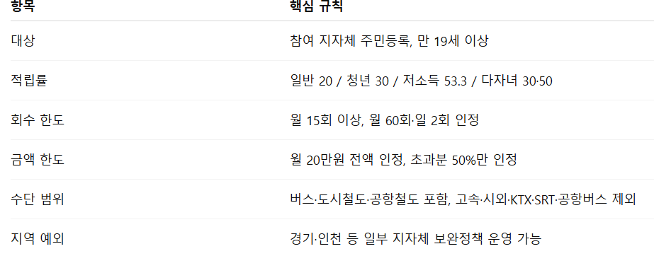 - 대상: 참여 지자체 주민등록이 있는 만 19세 이상. 버스·도시철도·공항철도 포함, 고속·시외·KTX·SRT·공항버스 등 별도 발권 수단 제외합니다.
