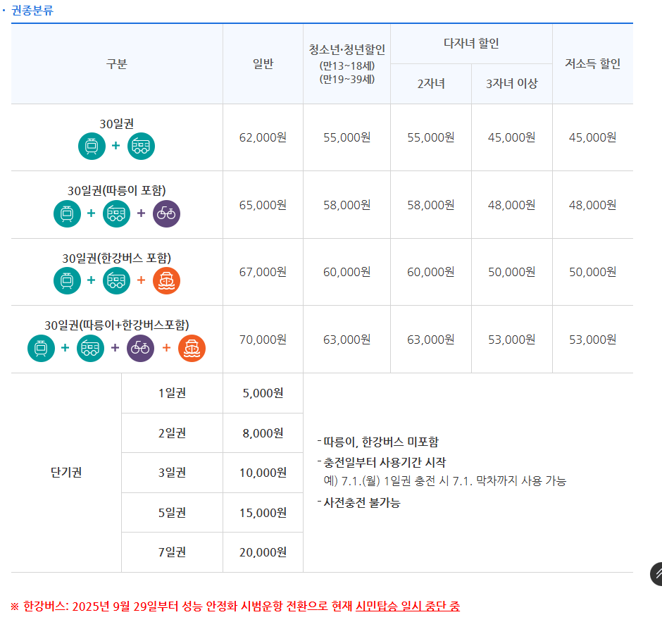 30일 정기권 1회 충전으로 기간 내 [서울권 지정 범위] 대중교통을 무제한 이용합니다(버스·지하철·따릉이·한강버스*).